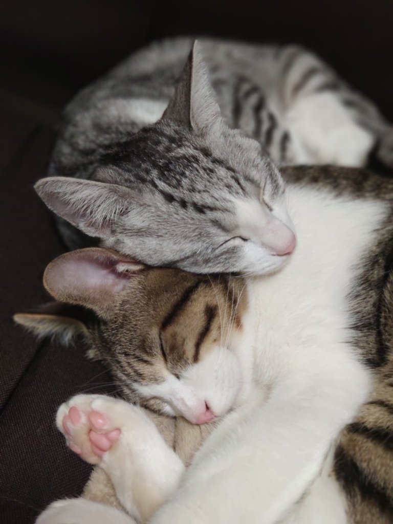 2匹とも膝の上で寝るのが好きなようで、お陰様で飼い主2人とも腰を痛めてしまいました